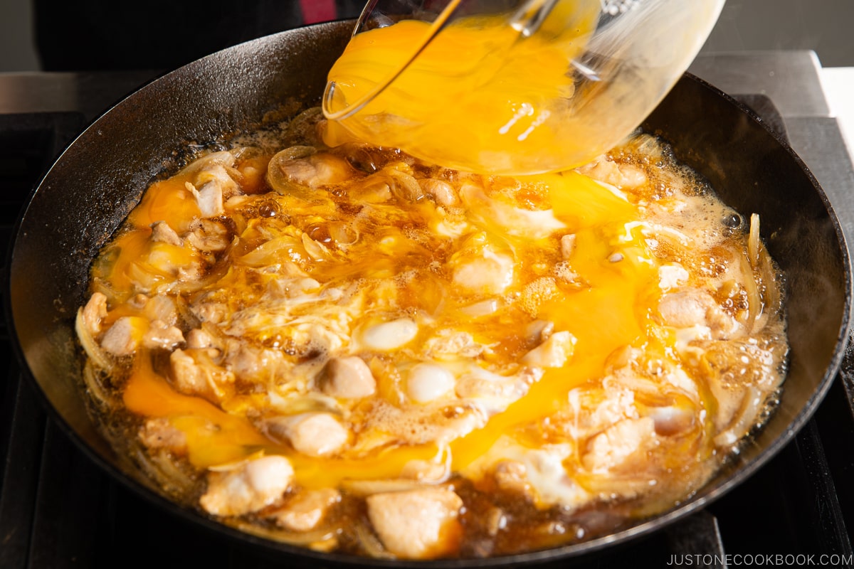 For the best-looking oyakodon, aim for high color contrast between the white and yellow parts of the eggs. That’s why it’s important not to beat the eggs. If you use a beaten egg mixture, you will get one uniform yellow color on your oyakodon.